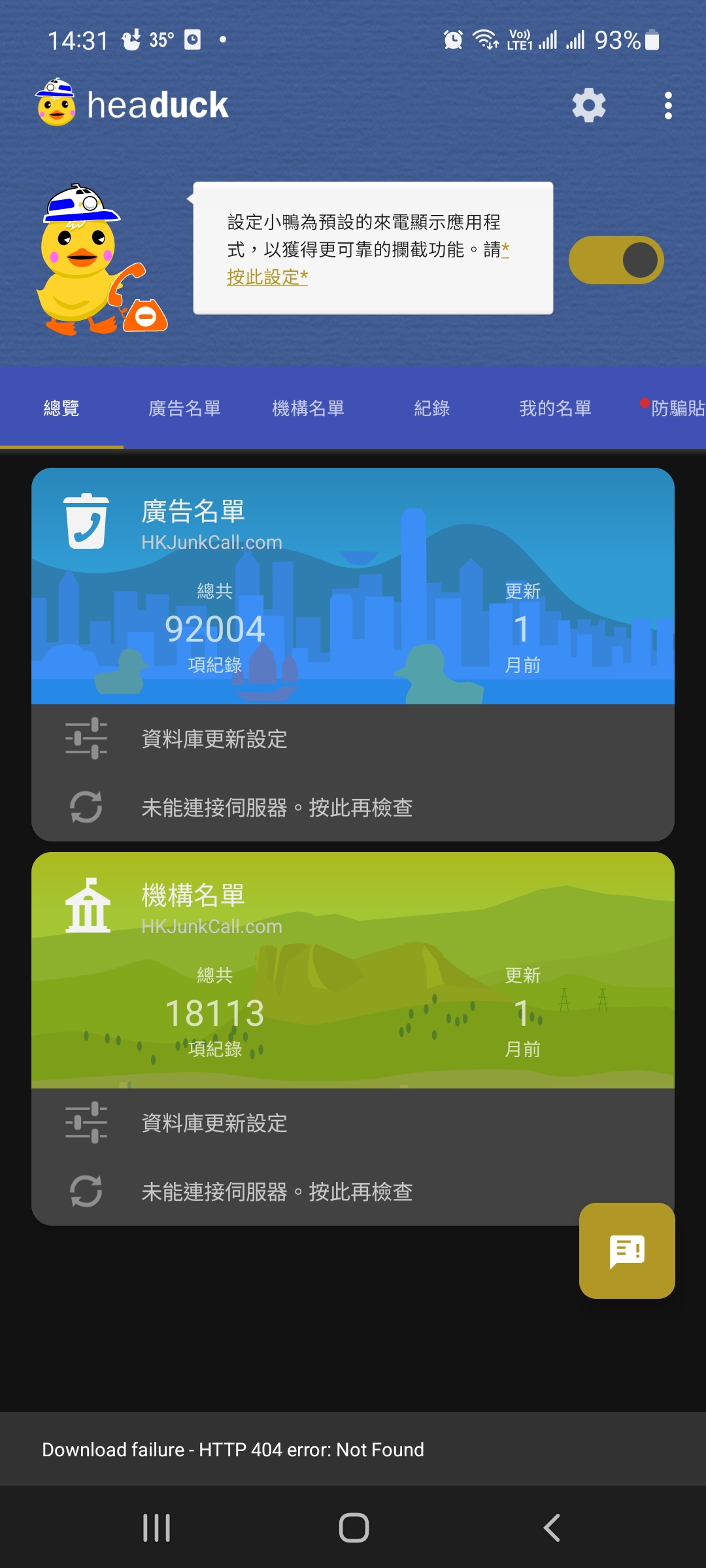 你好,我的來電資料庫在1個月前更新後一直不能更新,今天手動更新說未能連接伺服器,請問是否要重新在F-DROID更新才能連接來電資料庫?