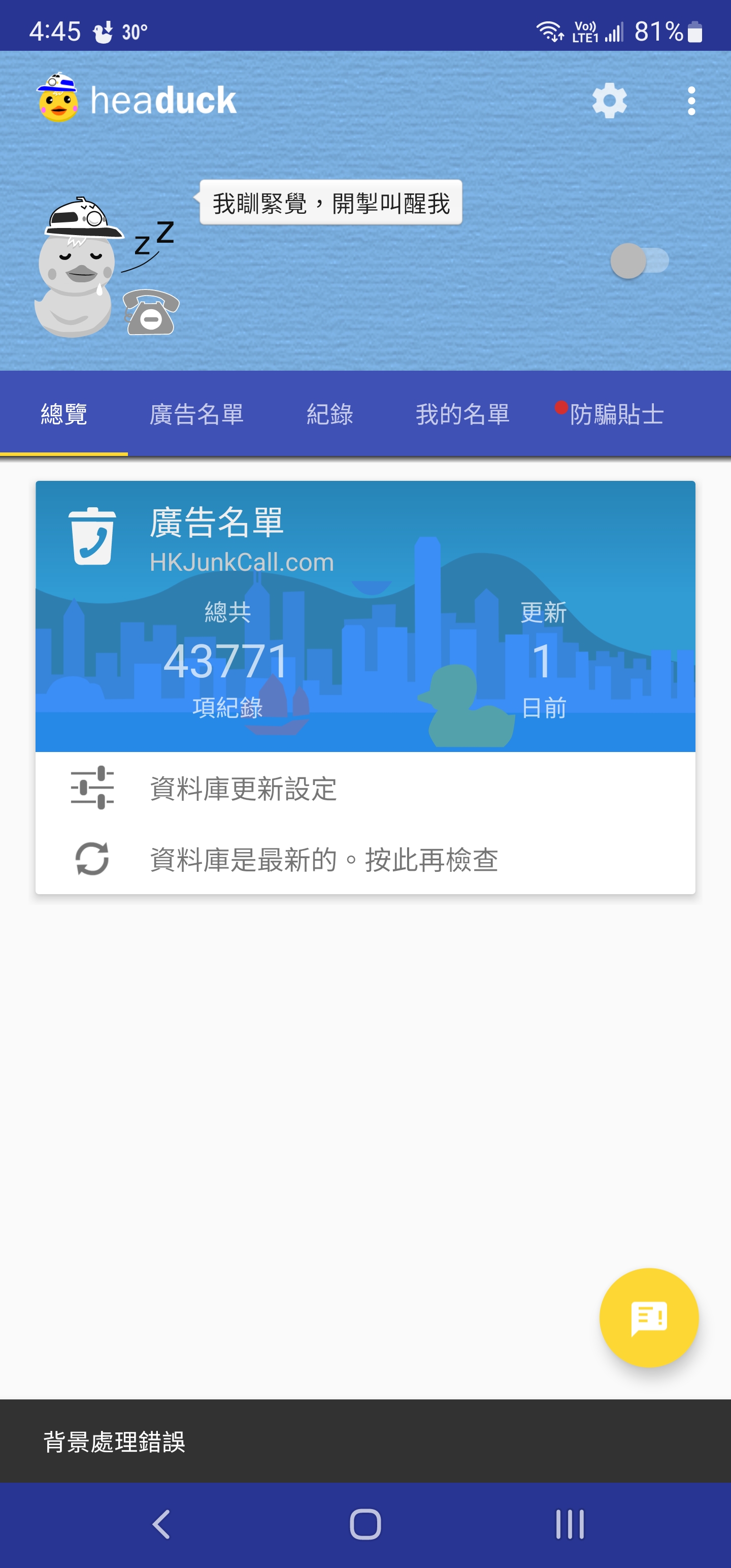 這星期,小鴨幹線0218版本更新完資料庫後,底部會出現背景處理錯誤,有廣告電話打入時也不攔截,設定沒有任何改變,之前一直使用也沒有問題